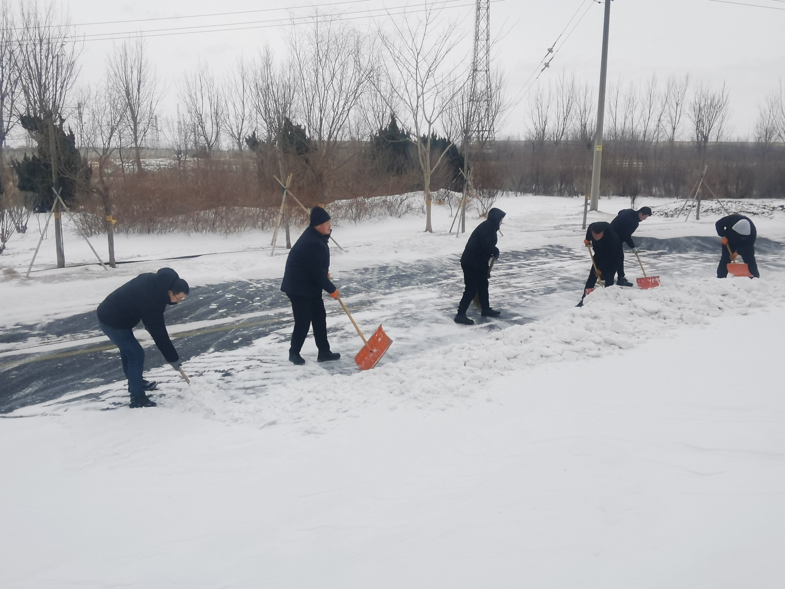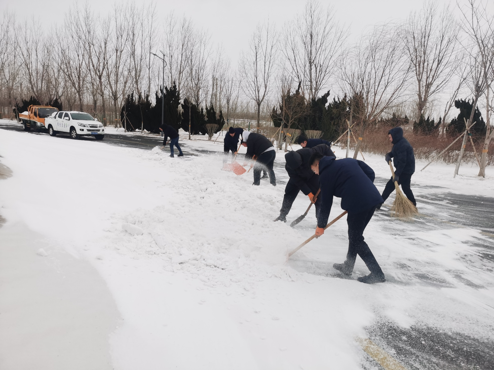 工作人員奮戰(zhàn)在除雪一線,頂風冒雪、不懼嚴寒,手持掃帚、鐵鍬等除雪工具,認真細致地清掃道路積雪,確保出行安全。